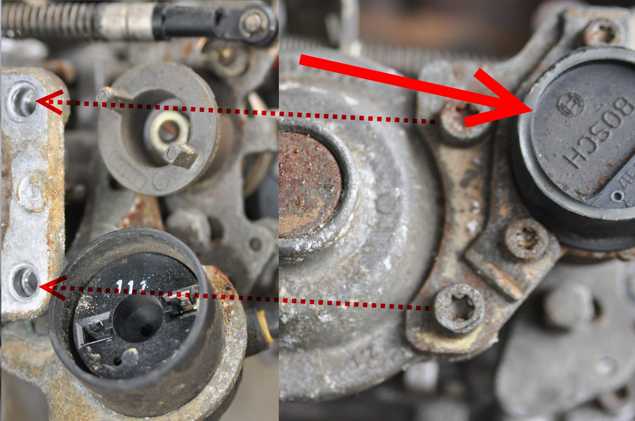 Capteur de température sur la culasse et petite plaque pour boucher l'emplacement de la vanne EGR. Électrovanne pneumatique par laquelle passe les fameux capillaires: Un capteur de la position de l’accélérateur Bosch sur la pompe à injection, qui a peut-être été supprimé également, dans ce cas on voit les deux ergots sur la petite pièce ronde sous la flèche pointillée du haut du haut: Donc l'importance de cette prise d'air est toute relative, c'est à dire que le système EGR peut fonctionner sauf que l'air absorbé par la vanne pneumatique, n'est plus filtré, ce qui a terme peut engendrer un encrassement de cette vanne, et donc une mauvaise commande par dépression de la vanne EGR. Mais bon, il y a tellement d'autre choses autrement plus agressives, qui engendrent un mauvais fonctionnement de cette vanne, que je me contenterais de boucher ce petit trou sur la boite du filtre à air avec un point de pâte à joint, pour éviter que le moteur absorbe une infime partie d'air non filtré.