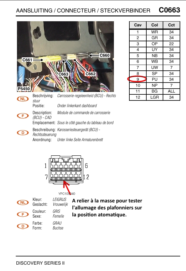 broche C0663-9 à la masse. Si cela allume, cela veut dire que le problème vient d'eux, ou de la liaison entre eux et le BCU. Comme la porte chauffeur et les autres portes ont un circuit distinct, je n'y crois pas trop, au moins l'un des cotés ferait fonctionner les plafonniers, étant donné que les commandes sont séparées (fil violet/blanc et fil violet/vert clair).