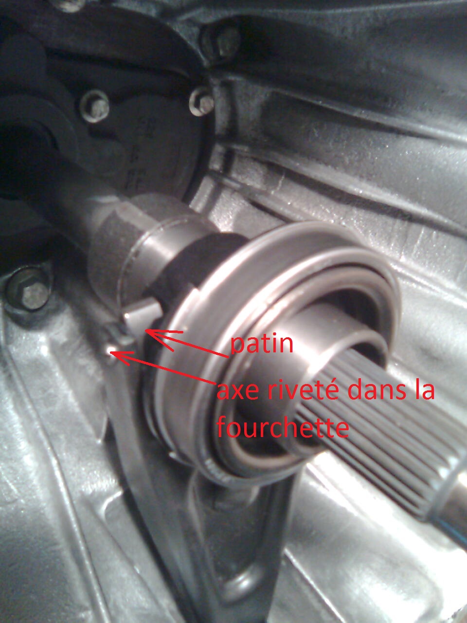 Un des 2 axes de patins s'est désolidarisé de la fourchette: quasi impossible vu le faible kilométrage de l'embrayage à moins d'un défaut de fabrication....