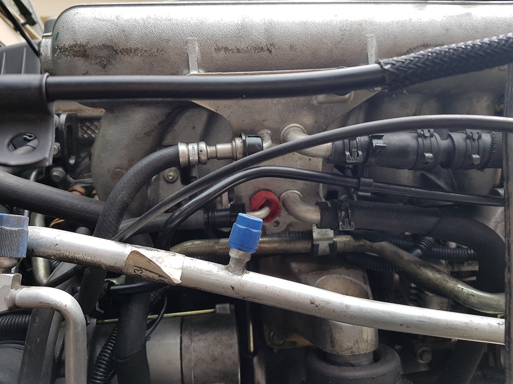 La durite de réchauffage gas oil qui part du collecteur d'admission (celle du bas) va a se brancher en bas du radiateur de refroidissement