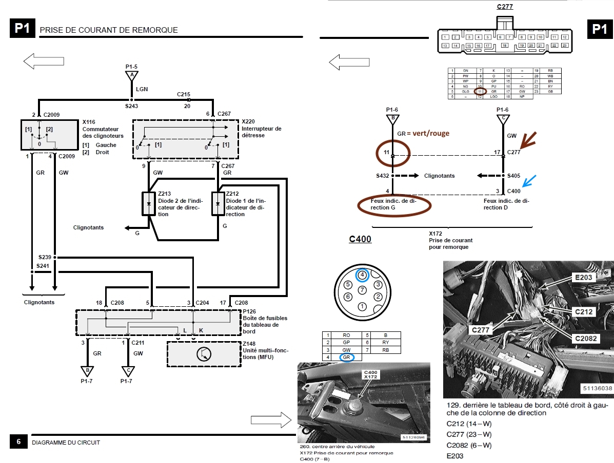 Pas facile à dire, sinon que le câblage n'est pas d'origine, à cause du fil jaune qui n'est pas la couleur d'origine pour le clignotant gauche. Sur le schéma tu devrais être avec fil vert liseré rouge. Donc probablement que le faisceau a été changé, une erreur, c'est peut-être glissé dans le câblage, vérifie que ton fil jaune est bien raccordé sur le fil vert liseré rouge sur le faisceau d'origine, à l'équivalent du point S432. Éventuellement teste avec un ohmmètre la liaison entre S432 le point de piquage sur le fil vert liseré rouge et la broche 4 de la prise de remorque, ton fil jaune est peut-être bien coupé quelques part, l'aspect en électricité, ne faisant certainement pas le moine.