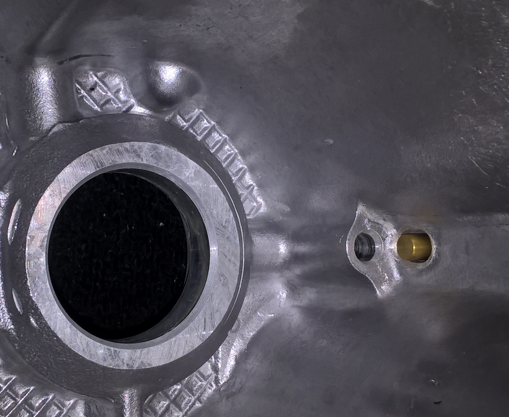 Je dois dire que j'ai choisi aussi cet emplacement, un taraudage de vis de fixation de boite, à cause de l'épaisseur de matière qu'il présente, car la parois du carter n'est pas hyper épaisse ailleurs.