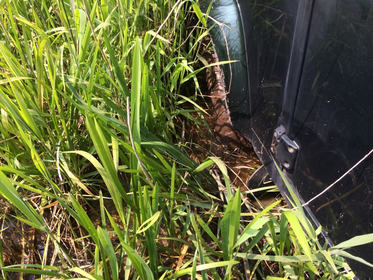 On a mis du dur derrière les roues avants, comme on a pu.... mais bof.... Après sondage, comme il était clair que la roue avant gauche était dans la vase jusqu'au moyeu et que le levage au cric LR dans la vase....bof bof.... stop. Trouver un tracteur ou un 4x4 pour me tirer est devenu une priorité.