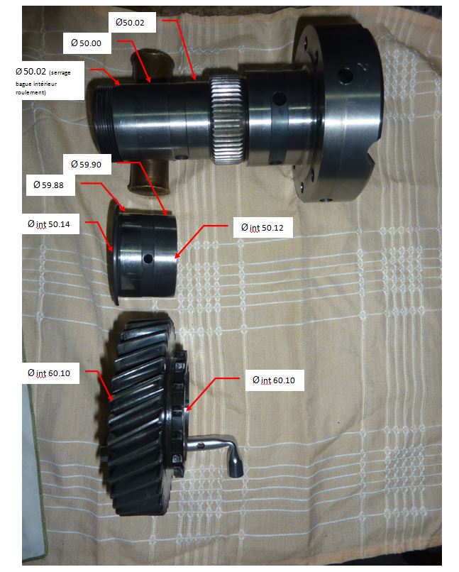 Pour le montage finale, prendre soin de bien center les axes dans le corps de différentiel. L’assemblage des pignons ne pose pas de problème particulier en suivant le manuel. Le manuel préconise un jeu de 0.05 mm à 0.15 mm entre les pignons de courtes/longues et le crabot. Rien n’est précisé dans le manuel sur les diamètres et alésages… je vous communique pour info mes mesures et jeux associés : Soit des jeux :