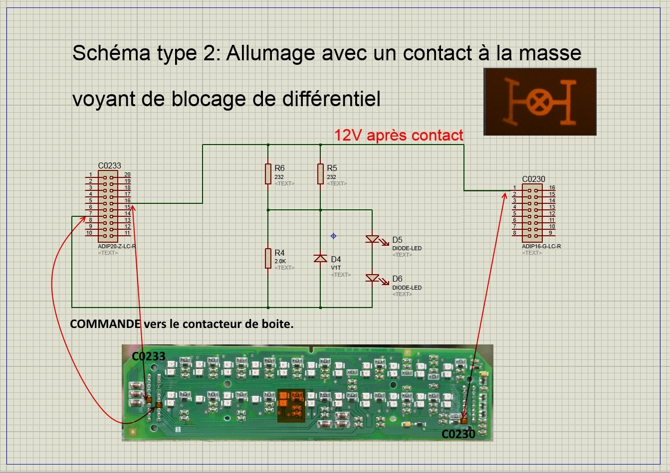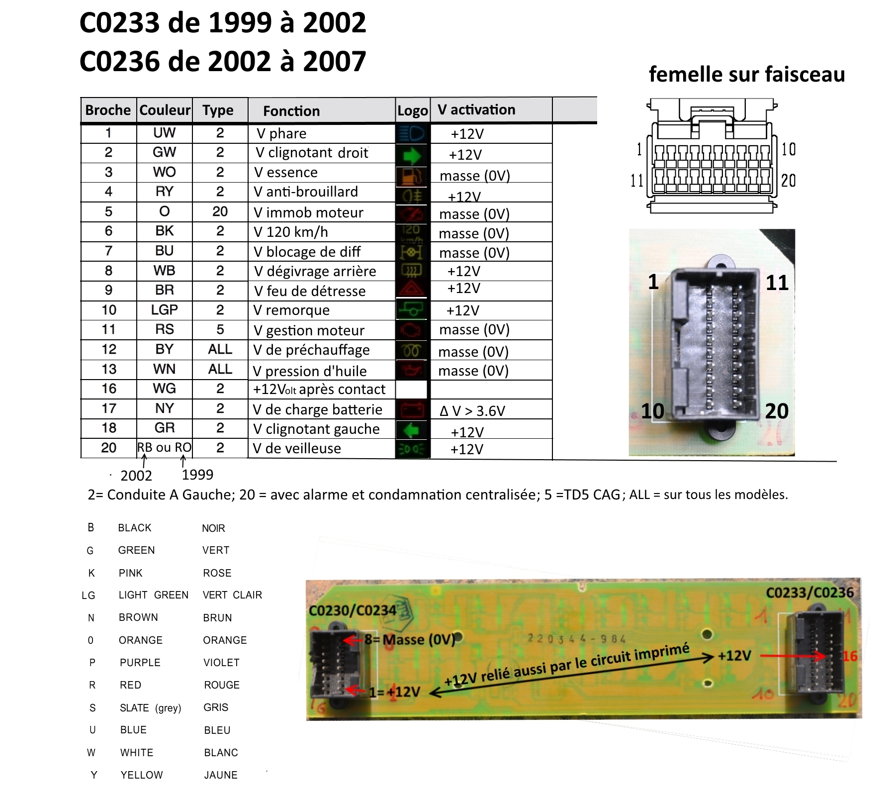 Si j'en crois les manuels électriques en ma possession, mais aussi les documents transmis pas Lolo (la broche C0230-8 est la masse sur le schéma de brochage), la particularité du tableau de bord de 1999 à 2002 est que les témoins, dont celui qui m’intéresse, sont mis à la masse dans le tableau de bord, et commandé par du +12V via les différentes sondes.