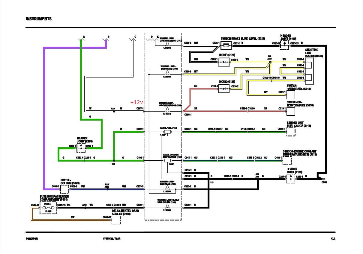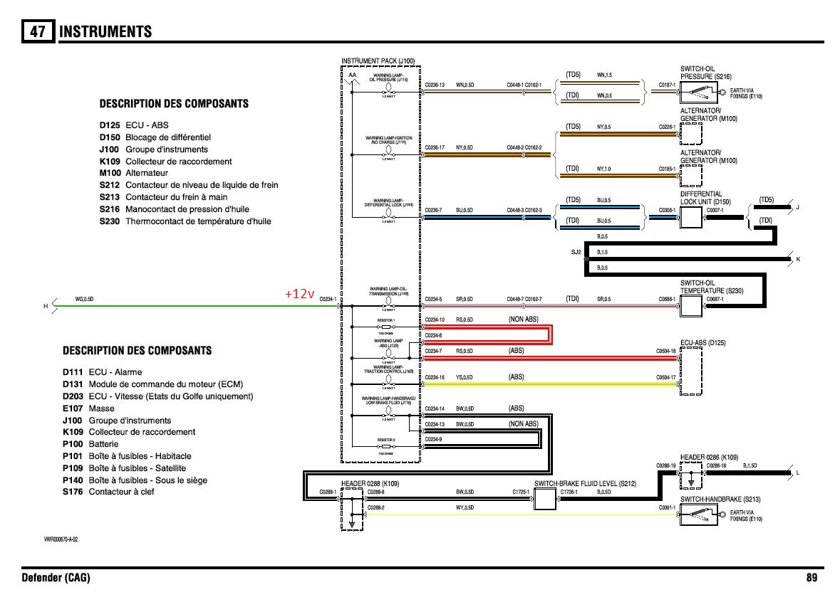 Afin de surveiller ma LT230 de mon 110 TD5 1999 fraîchement refaite, j'y ai monté une sonde de température, à l'image de ce que Land Rover a fait de série sur certain disco. En regardant dans le manuel conducteur, je m’aperçoit que le tableau de bord du def est lui aussi équipé d'un voyant qui pourrait me servir pour cet usage : effectivement, le manuel électrique décrit bien le fonctionnement de la sonde et du voyant : Et en regardant le schéma électrique, il y a bien un fil en attente sur lequel je pourrais me brancher pour allumer le voyant, selon le circuit surligné en rose ci-dessous : Mais ma question porte sur la diode cerclée en vert ? A quoi cela peut-il servir ? Je n'arrive pas à comprendre ce qui pourrait se passer lorsque la sonde va se fermer, et faire circuler un courant dans la diode ?