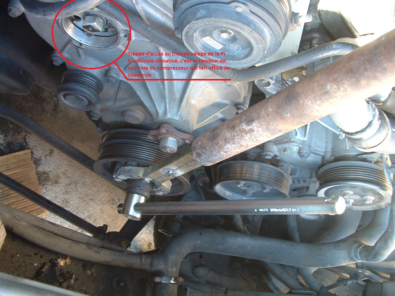 Ensuite tu as sur la carter de distribution un couvercle au droit de la poulie d'entrainement de la pompe. Tu ouvres et tu peux voir si la pompe est bien calée avec une pige.
