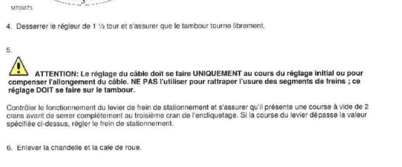 Avant de régler le câble et la course du frein à main, tu dois d'abord régler la position des garnitures par rapport au tambour. L'as tu fais ?