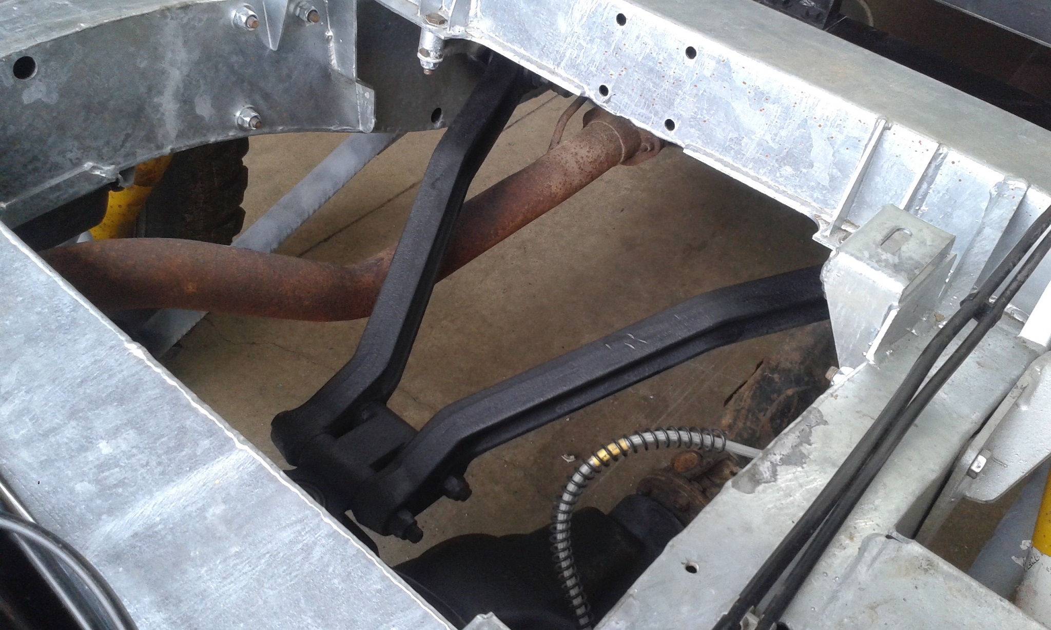 Sur le train arrière tu as le tirant (pièce grise)qui est fixé d'un coté sur le châssis par un silent block qui permet un mouvement de rotule et coté pont il est fixé par un silent block qui permet une rotation autour de son axe, et le troisième point est constitué par le "A frame" que l'on voit sur la deuxième photo et la troisième(pièce rouillée au 1° plan avec sa rotule en haut du pont et repeinte en fin de chantier). Ces trois points permettent au pont un mouvement vertical de bas en haut et un pivotement autours de la rotule. au repos le système permet au pont de monter mais également de descendre. Si quelque chose bloque et empêche l'un coté d'un pont de descendre on pourrait avoir un véhicule qui penche mais je ne vois pas trop quoi