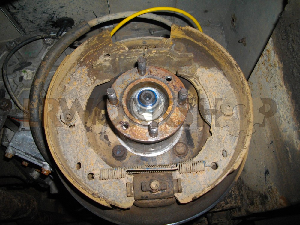 Très facile de sortir le tambour (aussi facile qu'un tambour AR de frein d'une vielle Clio...) pour mettre des boulons neufs et, en profiter pour vérifier le mécanisme :