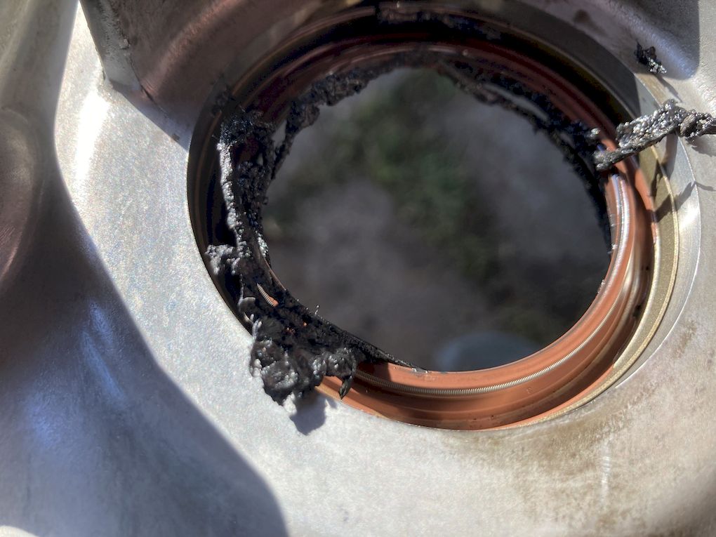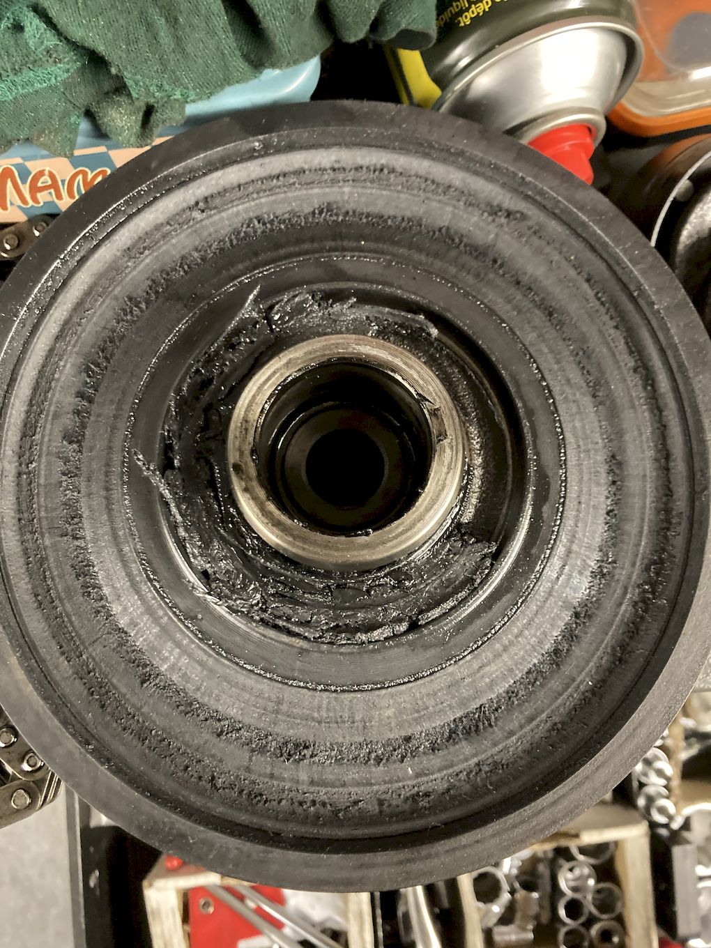 En tout cas, à l'endroit où ça s'est enroulé sur la photo il n'y a que de l'acier. Peut-être le reste d'une ancienne courroie accessoire qui serait venu s'enrouler ici ? Quoique la matière ne me semble pas correspondre.