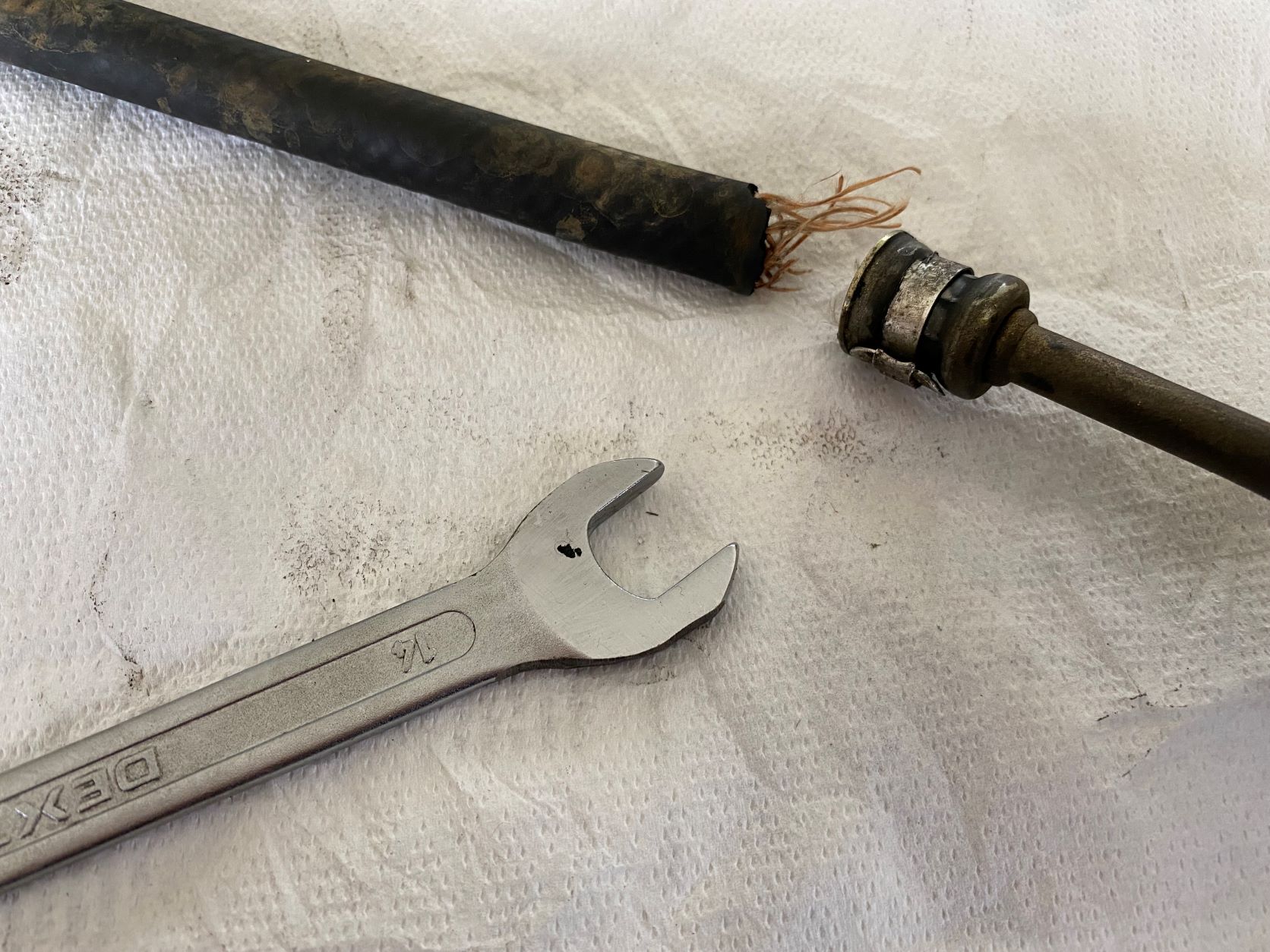 MAJ 16/10/22=> en fait usure et donc pression trop forte (4bars) (le fait de conserver cette conduite comme je l'ai fait ne se révèle pas forcément une bonne idée -la triturer pour la déconnexion/reconnexion a dû la fragiliser- voir photo ci-dessous de la rupture (après avoir joué sur sa flexibilité par rapport à la partie métallique la durite s'est facilement déchirée); la photo montre également la clé de 14 affinée Sinon, je dispose de la 3ème conduite, donc je vais la mettre en place, mais je n'ai pas trouvé d'astuces particulières dans le post cité concernant le remplacement un peu compliqué de cette 3ème conduite à part la clé de 14 customisée