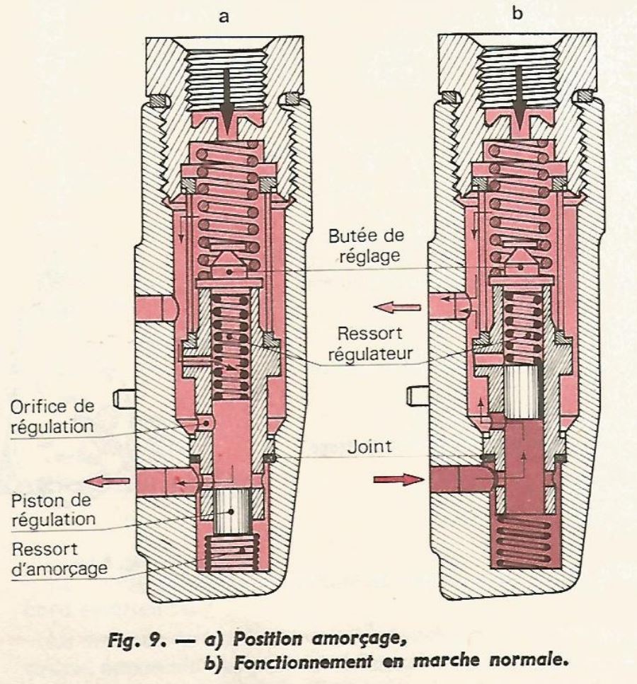 - une position dite « de régulation » qui, comme son nom l’indique, permettait l’obtention d’une pression strictement proportionnelle au régime de rotation du moteur, laquelle jouait un rôle capital dans la gestion du point d’avance, d’où un certain niveau d’exigence sur la qualité de sa régulation.