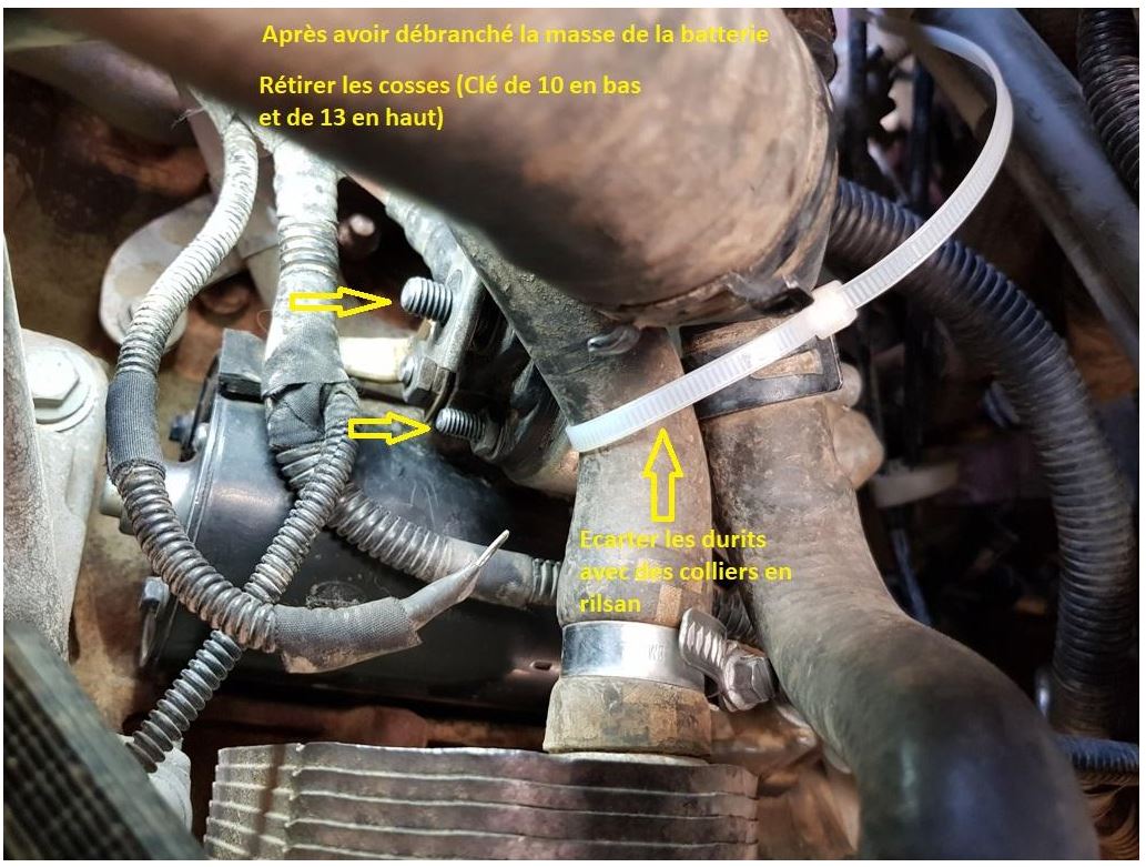 La brèche dans la pare boue côté gauche (conducteur) Le raccordement électrique du démarreur L'écrou bas L'écrou haut