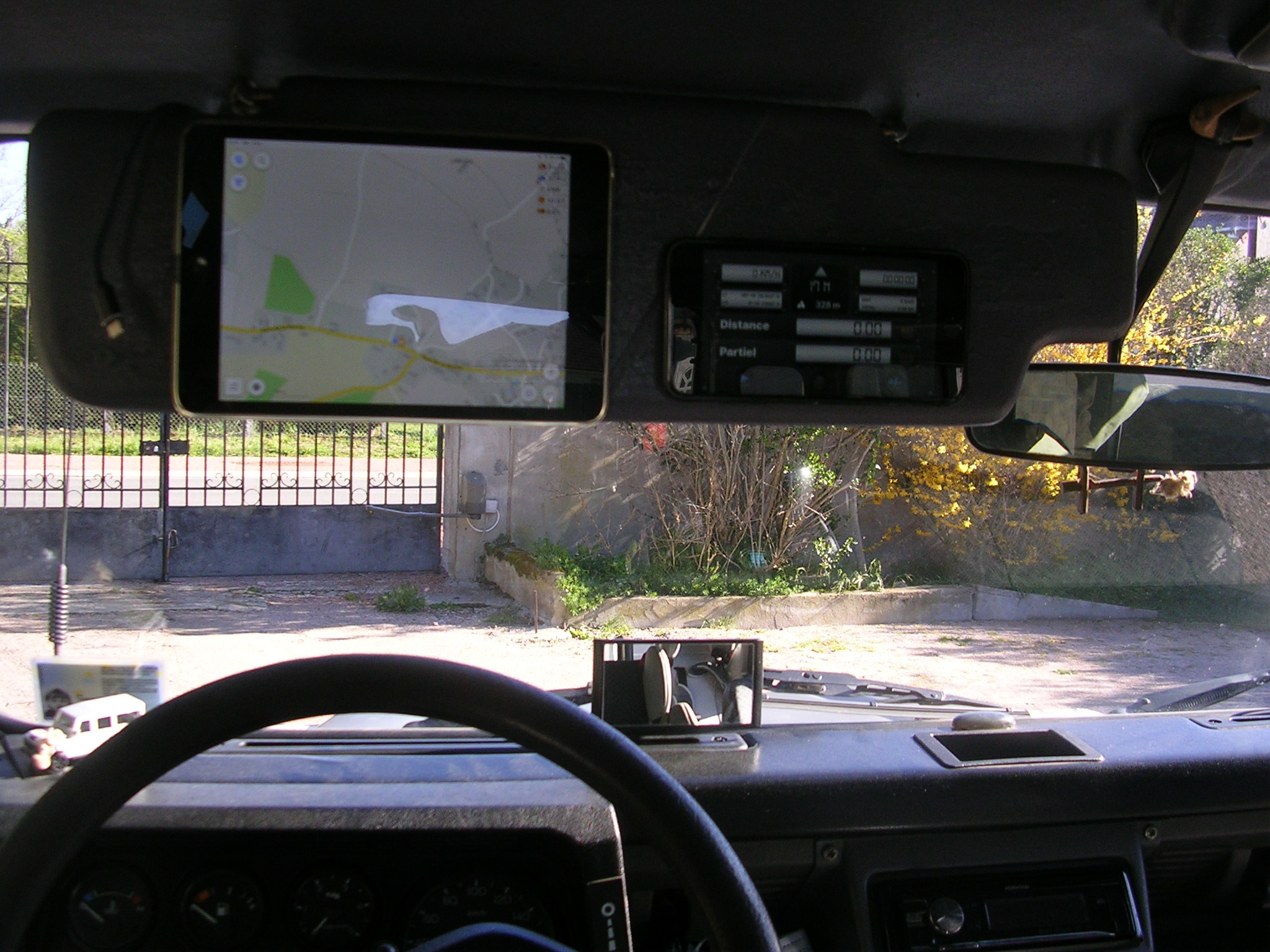 Sur mon Défender, plutôt que de percer le tableau de bord pour fixer un GPS, j’utilise le pare soleil.