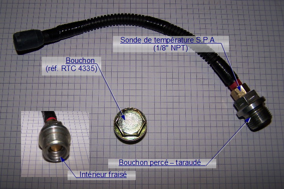 La pose d'un thermomètre est assez facile, en place de l'un des deux "bouchons" inférieurs (réf. RTC4335) de la BVA (pièce n°17 sur la vue Microcat, ci-dessous). Il faut usiner ce "bouchon", fonction du diamètre et du pas de la sonde choisie. En raison de la position de la sonde, un dévissage serait catastrophique, "bouchon" réusiné et sonde sont tous deux percés au diam. 1,5 mm afin d'être freinés par du fil inox à torsader. Système simple, fiable, et surtout très facile à contrôler.