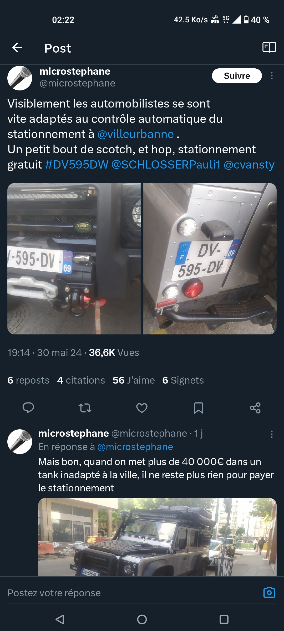 J'ai aussi vu passer ce message sur twitter....et suis assez stupéfait de l'aigreur des réactions qui se concentraient non pas sur le scotch, ou le système de contrôle automatisé et quasi permanent mais bien sur ce gros 4x4 avec tous les jugements de valeur de gros beauf à pollueur irresponsable en passant par sale riche (un mec s''est même amusé a remonter le modèle via la plaque et regarder les prix sur lac...)... d'autant que les Def sont quand même peu nombreux dans les grandes villes