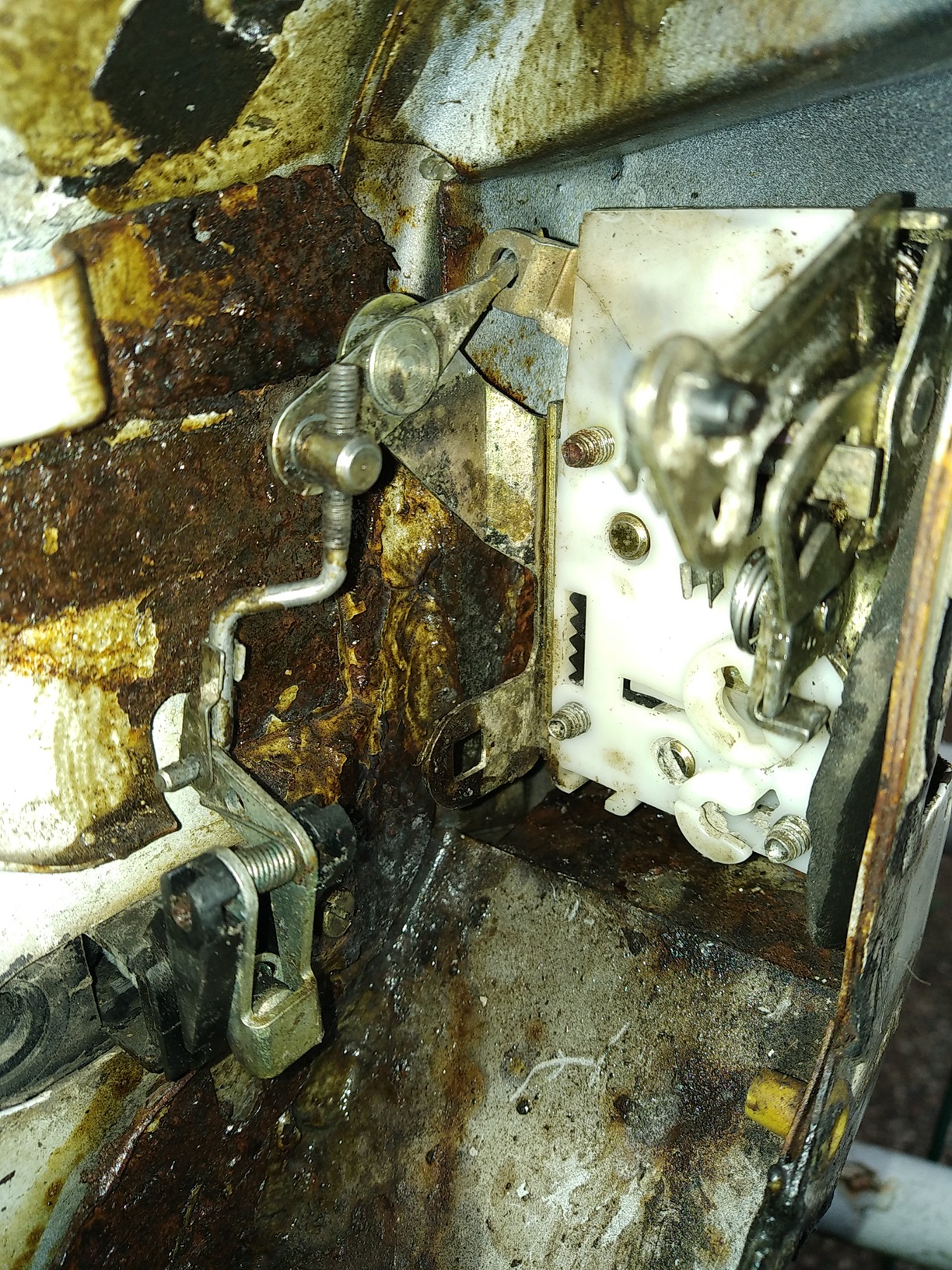 sur la gauche il y a la commande d'ouverture du pêne, à droite les verrouillages (fermeture de porte et sécurité enfant, c'est une serrure de porte AR)