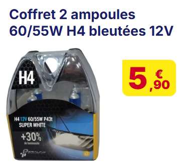 Sinon, en cherchant bien sur internet, tu trouveras plusieurs offres correspondant à cet intitulé, mais les prix varient selon le distributeur : Ayant pris ce kit d'ampoules H4 +30% d'éclairage chez un distributeur local à prix cassés, et après un réglage aux petits oignons des hauteurs de phares, la route m'a semblé plus lumineuse au retour, à la nuit tombante .... Mais je ne serais pas impartial, car mes anciens phares étaient déficients : sur la rocade, il me fallait rouler en phares pour éclairer le sol, la faute à une absence de réglage avant de changer les optiques.